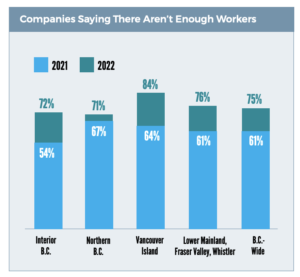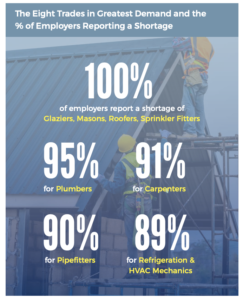 In four trades – glaziers, masons, roofers and sprinkler fitters – 100% of companies employing those trades reported a shortage of labour. Plumbers (95%), carpenters (91%), pipefitters (90%), and refrigeration and HVAC mechanics (89%) are also desperately needed.