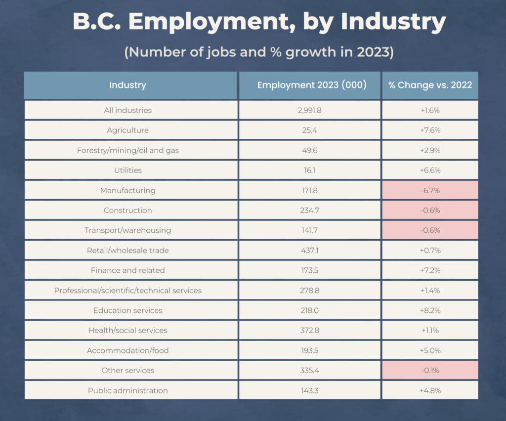 The employment rate – the share of the population aged 15 and over that’s employed– dipped in 2023, averaging 61.8%, down from 62.1% the year before. In the three years preceding the pandemic, B.C.’s employment rate hovered in the range of 62.6% - 63.1%. The gently falling employment rate likely reflects a combination of population aging and a private sector economy in which some industry sectors are shrinking or unable to grow, as discussed below.