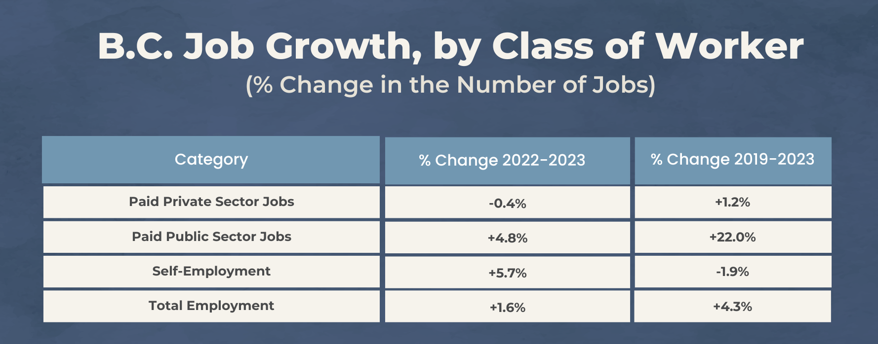 More compelling evidence emerges from an examination of the pattern of job growth across the broad public and private sectors – not just in 2023, but over the last several years. Table 2 provides the details. The number of private sector payroll jobs in B.C. actually fell last year, while public sector employment jumped by almost 5%. Self-employment also rose significantly, up by 5.7%. Within Canada, B.C. was the only province to experience a contraction in private sector payroll positions in 2023.