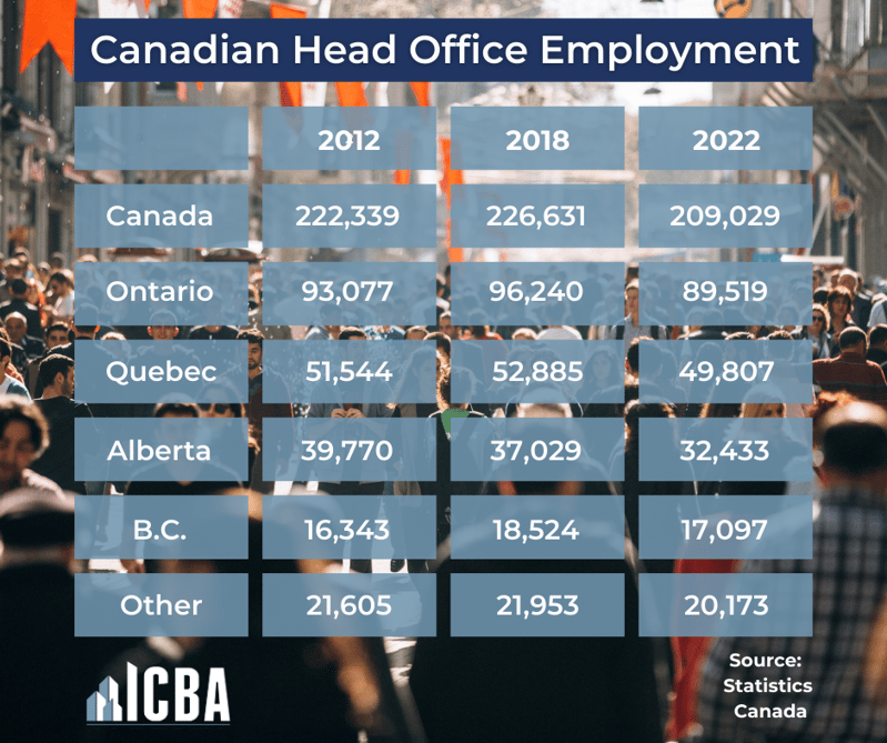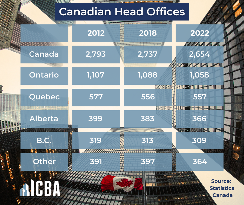 Alberta, with 800,000 fewer people, outperforms B.C. on both metrics, hosting 14% of the country’s headquarters and 12% of all direct Canadian head office jobs. See Tables 1 and 2 for data on the evolution of head offices and related employment in Canada from 2012 to 2022.