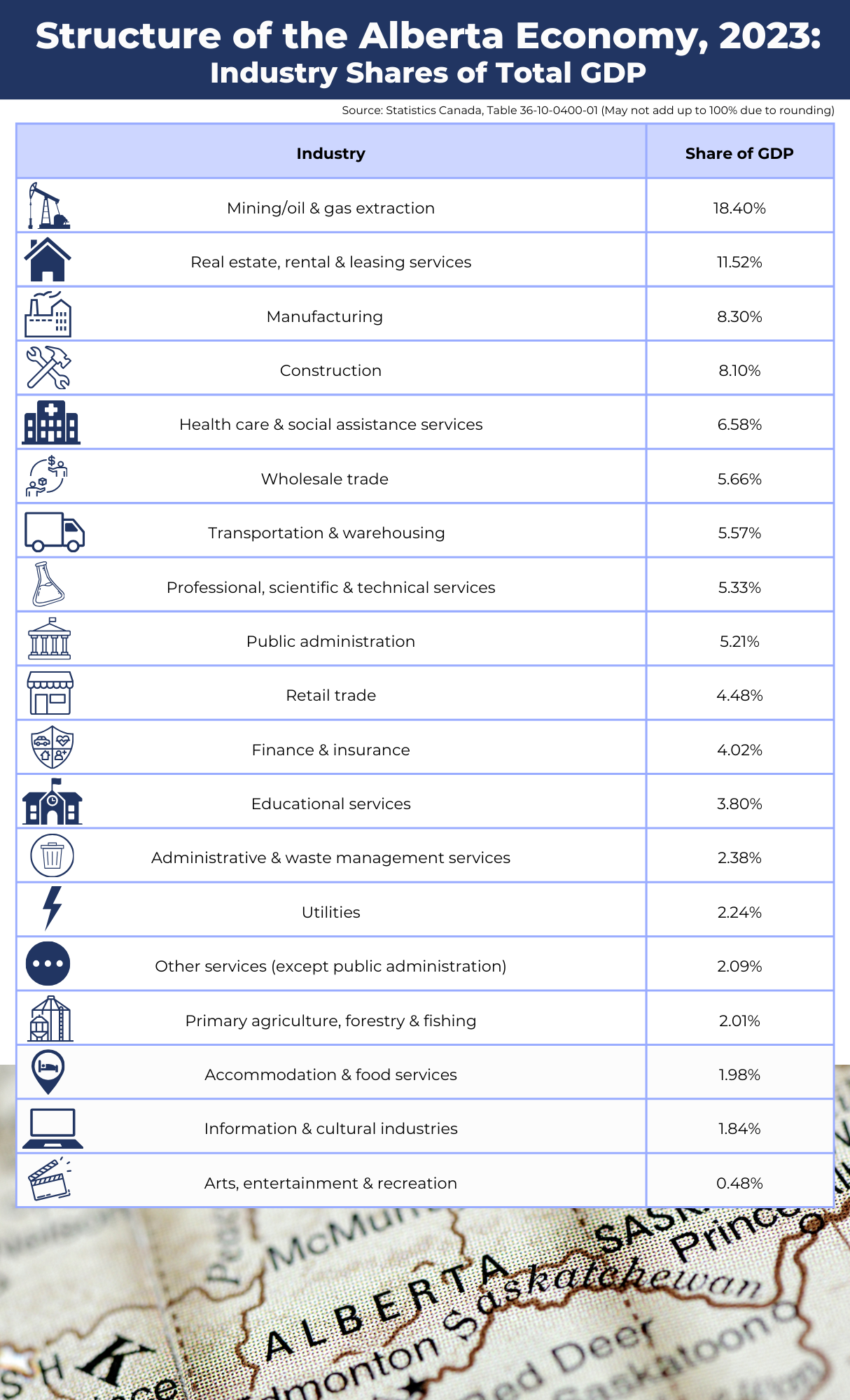 Other aggregate NAICS sectors that produce at least 5% of Alberta’s economic output are transportation and warehousing; professional, scientific and technical services; wholesale trade; and public administration.