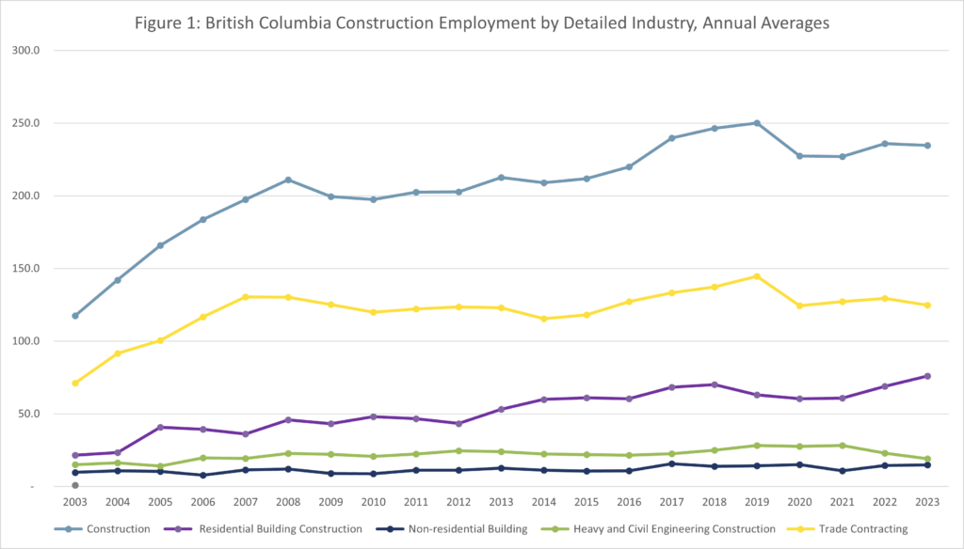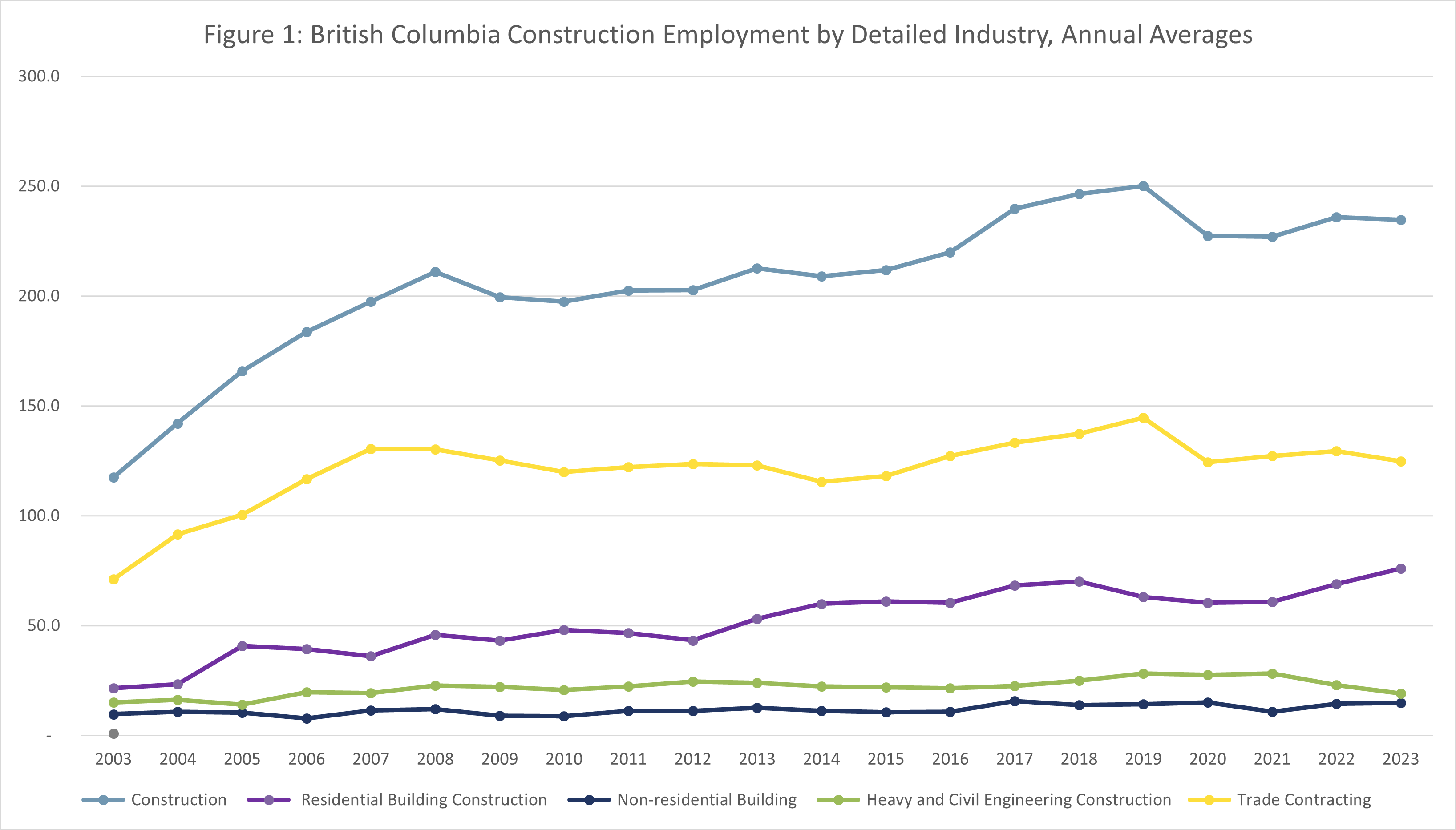 Figure 1 charts the trends in construction employment in B.C. over the last two decades, showing total industry employment as well as the number of positions in the main industry sub-sectors. A few observations can be made about the picture presented in Figure 1: