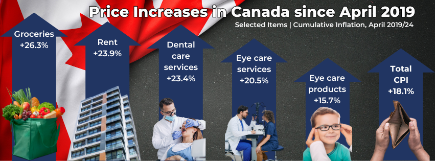 The good news is that inflation is easing. After surging almost 7% in 2022, the all-items Consumer Price Index (CPI) increased by a more moderate 3.9% (annual average) last year. For 2024, RBC Economics predicts a further drop, to 2.4%. Decelerating inflation is setting the stage for lower interest rates, with the Bank of Canada delivering an initial cut in its short-term policy rate in June. This suggests the conditions may be in place for a much-needed pickup in economic growth over the next year. However, Canadians will continue to face the legacy of higher prices for many goods and services after the inflation scare of 2021-23. Figure 1 shows the cumulative increase in prices for several items included in the CPI over the five years ending in April 2024.