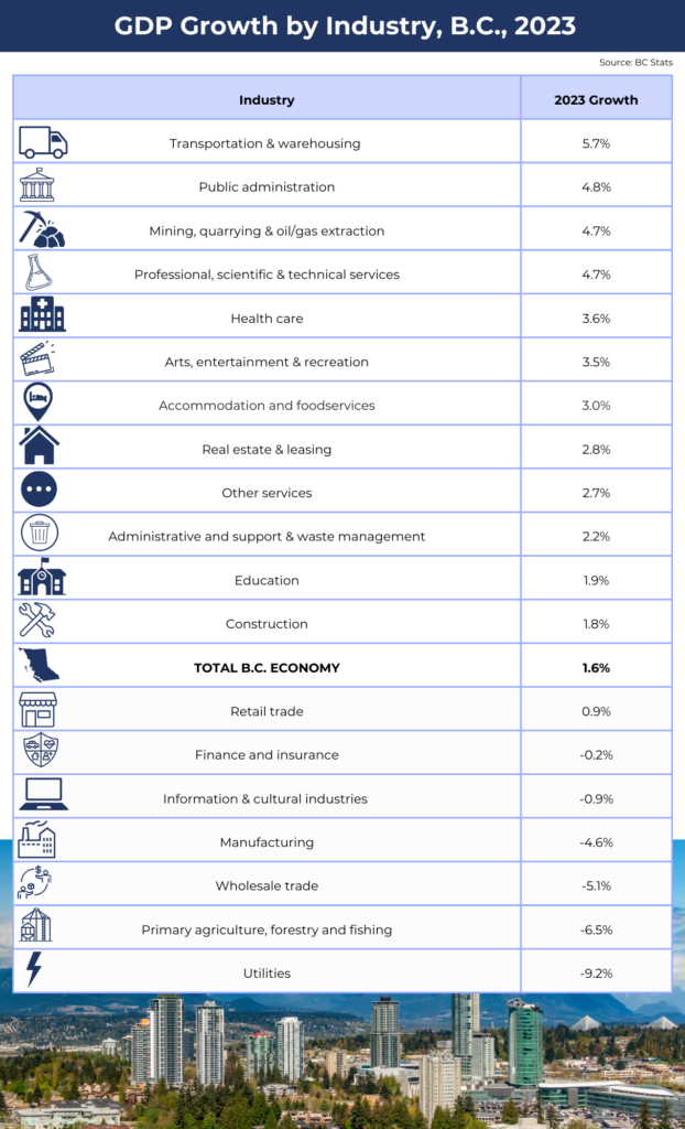 Preliminary estimates from Statistics Canada show that B.C.’s economy grew by a modest 1.6% after inflation in 2023, down sharply from almost 4% the year before. The pattern of growth varied significantly across the industries that make up the provincial economy.