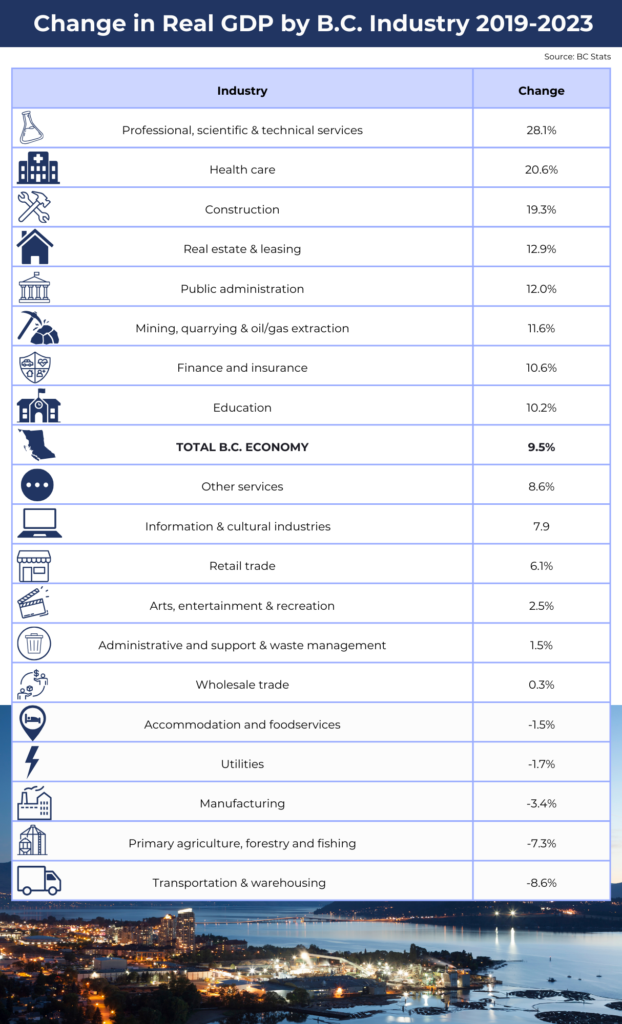 At the aggregate level, the B.C. economy expanded by 9.5% during the four-year period, which captures the effects of the COVID-induced recession in 2020 following by the bumpy post-pandemic recovery.