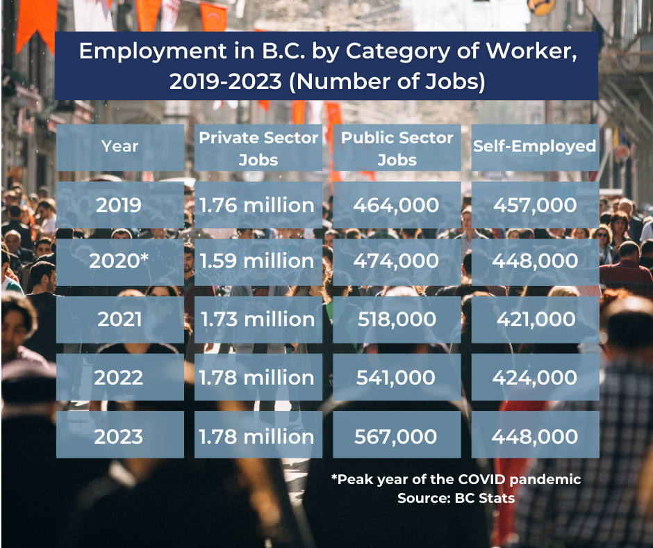 Another important data point is that every other province in the country has handily outperformed British Columbia in creating jobs across the broad business community in the last few years (going all the way back to 2019, in fact). This should be a top-of-mind concern for policymakers in Victoria. Yet instead of acknowledging and tackling the problem, they prefer to ignore it and persist with policies – higher taxes, mounting regulatory and paperwork burdens, massive deficits, more government intervention – that increasingly look to be sucking the life out of the private sector economy.