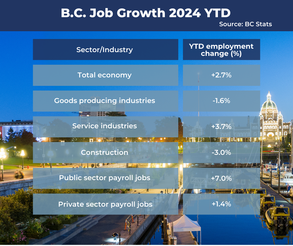 July 2024 brought another downbeat report on the state of the B.C. labour market, confirming that the province currently faces an unappetizing mix of feeble employment growth and rising joblessness. According to the July Labour Force Survey, total employment dropped by 24,000 from the month before (actual rather than seasonally adjusted figures). In the same period, B.C.’s unemployment rate jumped to 5.9%, up from 5.1%. Year-to-date, employment in the province has risen. But most of the net new jobs are in the public sector.