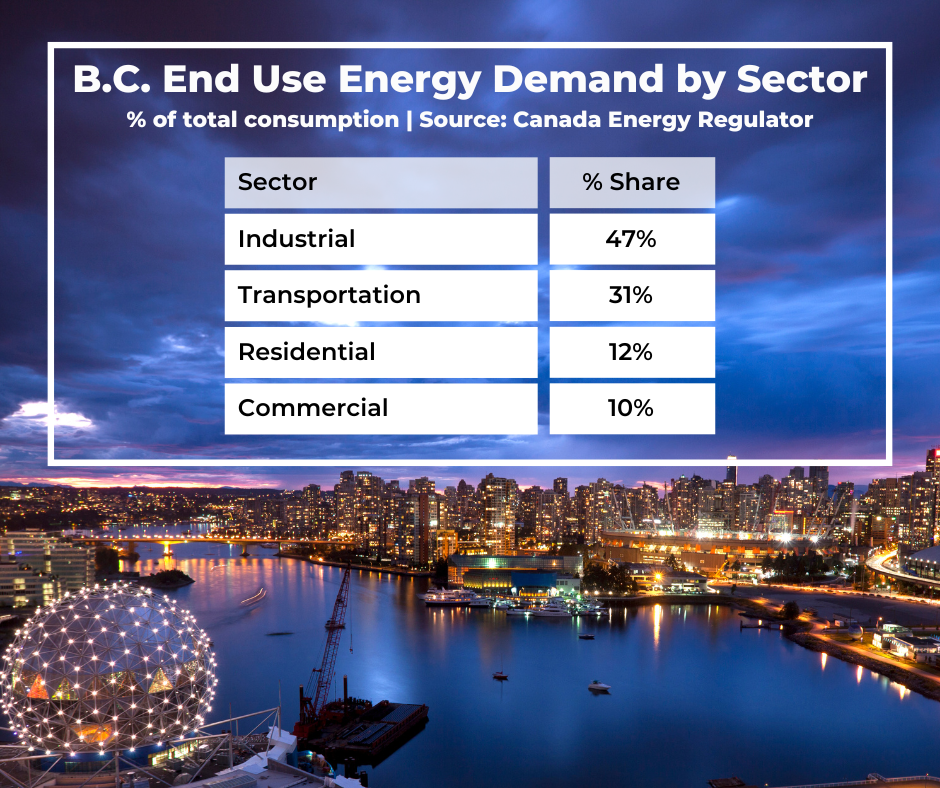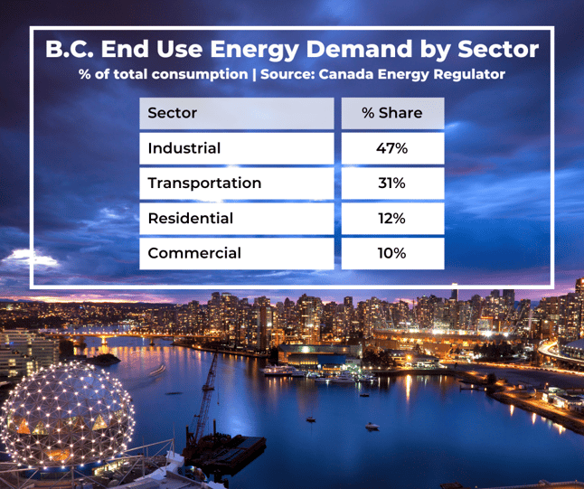 Based on Natural Resources Canada data, industry, collectively, is responsible for about 47 per cent of final end-use energy demand in British Columbia; this category includes manufacturing, natural resource extraction and processing, and construction. Transportation is the second largest consumer of energy (31 per cent of final demand), followed by the residential (12 per cent) and commercial sectors (10 per cent).