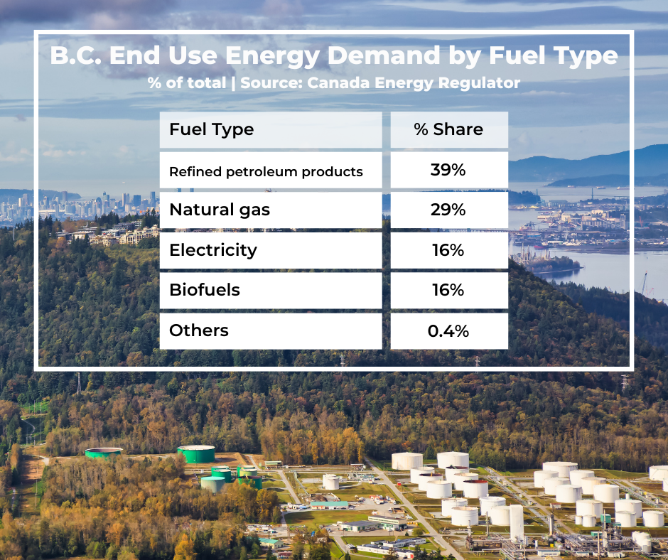What types of energy do British Columbians rely on? Refined petroleum products (including gasoline and diesel) rank first, providing almost two-fifths of the energy consumed in the province. Natural gas is second (29 per cent). Electricity makes up just 16 per cent of the energy used in B.C., while bio-fuels chip in a similar share. Thus, carbon-based fossil fuels still deliver about 70 per cent of the energy British Columbians consume in a typical year.