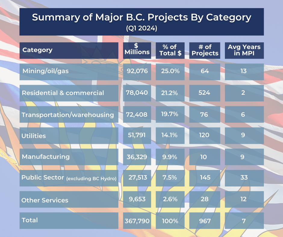 As of the first quarter of 2024, there were 967 projects listed in the MPI, totaling $368 billion in estimated capital spending were they all to go forward. Importantly, 309 of these projects (representing $116 billion of capital costs) are either in the public sector or depend on government funding to proceed – underscoring the importance of the public sector in today’s B.C. economy.