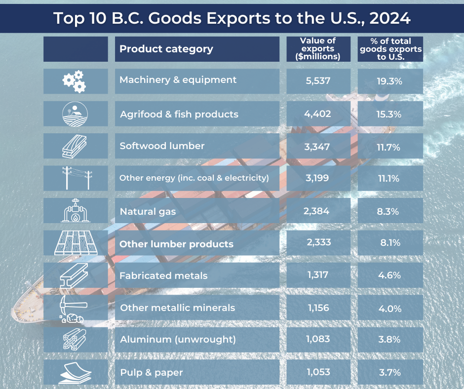 On the export side, last year B.C. shipped almost $30 billion of goods to the United States. All of these exports would face new American tariffs in a worst-case scenario. Figure 1 summarizes the main categories of the province’s U.S.-destined exports. Perhaps surprisingly, the broad machinery and equipment category – which includes a mix of aerospace-related parts and components, other advanced technology products, transportation equipment, scientific instruments, and many other high-value goods – looms largest, representing close to one-fifth of B.C.’s exports to the U.S. last year. Agri-food and seafood products and softwood lumber rank second and third among the province’s exports to the U.S. It should be noted that non-softwood lumber products and pulp and paper are also in the top ten export list; if we add these to softwood lumber, the overall forestry sector supplies almost one-quarter of B.C.’s merchandise exports to the U.S.