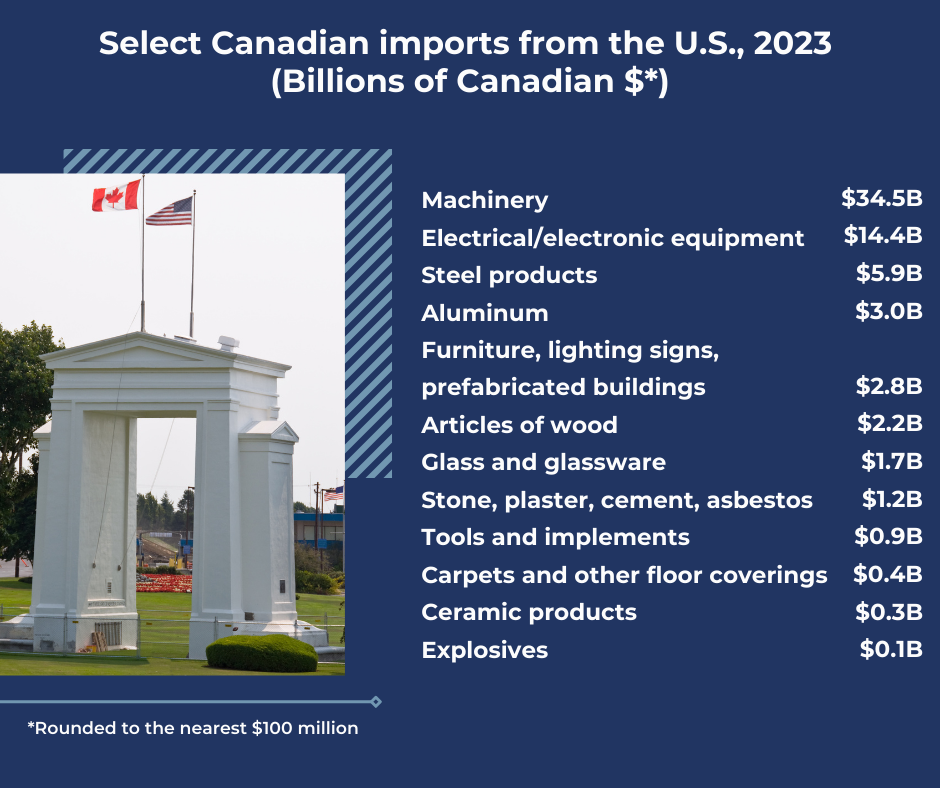 We can start by looking at the categories of Canadian merchandise imports from the United States which are most relevant to construction. Exhibit 1 lists many of these and shows the value of Canada’s imports from the United States in 2023. The large category of “machinery” is included because it encompasses various types of equipment as well as certain specialized vehicles (e.g., backhoes) used by construction companies in Canada.