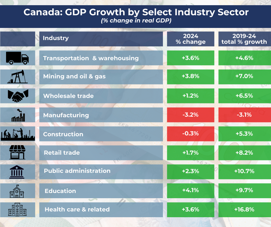 Looking at economic growth by industry, Figure 2 shows the percentage change in real GDP across the main Canadian industry sectors in 2024, as well as cumulative output growth over the period 2019-2024.