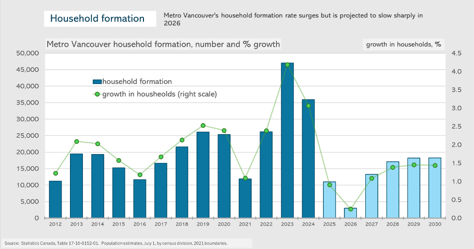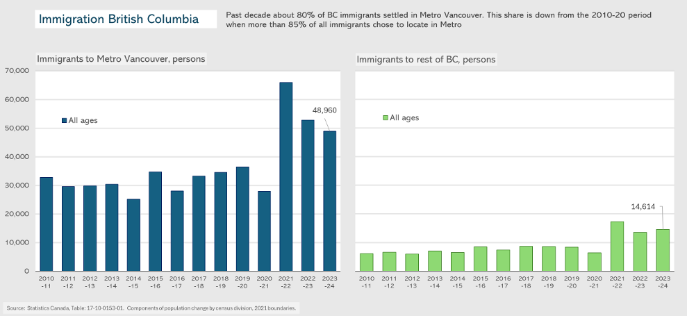The number of immigrants arriving in Metro Vancouver has recently been running at almost double the historic norm – in the case of permanent newcomers. There has been an even larger increase in the number of non-permanent residents – matching the picture across much of Canada since the pandemic. However, with the federal government abruptly shifting course on immigration policy late last year, international in-migration to the Vancouver area is expected to drop sharply in the next two years, before rebounding by 2027. This immigration “pause” may provide some temporary relief amid ongoing shortages of affordable housing and long waits to access health care and other services.