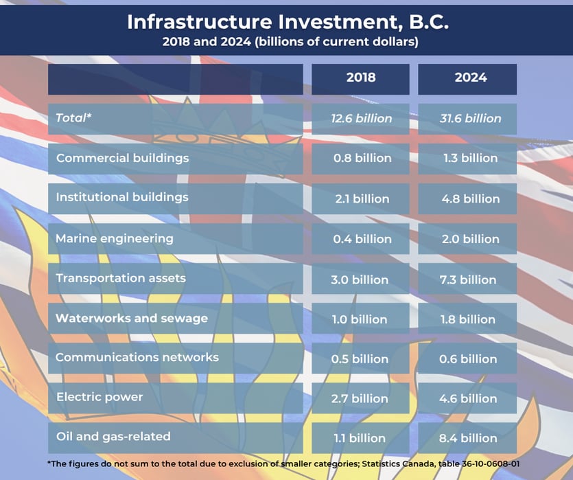 In British Columbia, infrastructure investment spending rose dramatically over the period, due in large part to ongoing work on several major energy-related projects as well as ramped-up public sector capital outlays on transportation infrastructure, hospitals/schools, and electricity generation/transmission (mainly via government-owned B.C. Hydro). Marine engineering infrastructure investment also increased owing to significant new port projects. In dollar terms, the four top categories for B.C. infrastructure investment in 2024 were oil and gas construction, transportation infrastructure, the institutional sector, and electric power. Large capital outlays on oil and gas construction are explained by pipeline projects that have now concluded; back in 2018, investment in oil and gas infrastructure was less than one-eighth of the level reported last year. With the winding-up of major energy-related projects, B.C. faces the prospect of a much weaker investment spending profile over the coming years – underscoring the need for policymakers to redouble efforts to attract more private sector investment in sectors such as mining, LNG development, electricity generation, and transportation infrastructure.