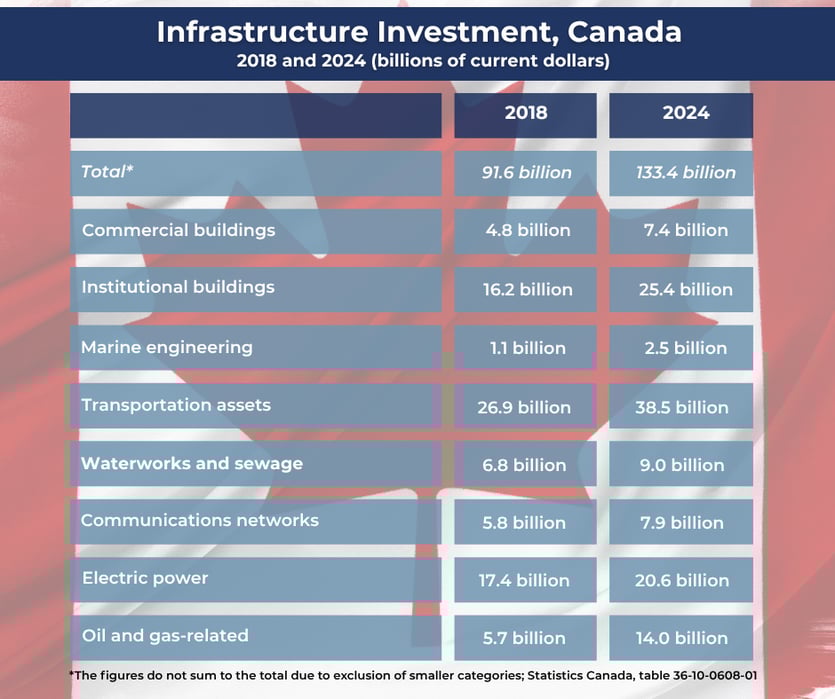 Nationally, the four largest infrastructure asset categories, in order of the amount invested in 2024, were transportation/engineering infrastructure; institutional buildings; electric power; and oil and gas engineering construction. Smaller sums were allocated to communications networks; commercial buildings; waterworks and sewage infrastructure; marine engineering infrastructure; and a few other minor categories.