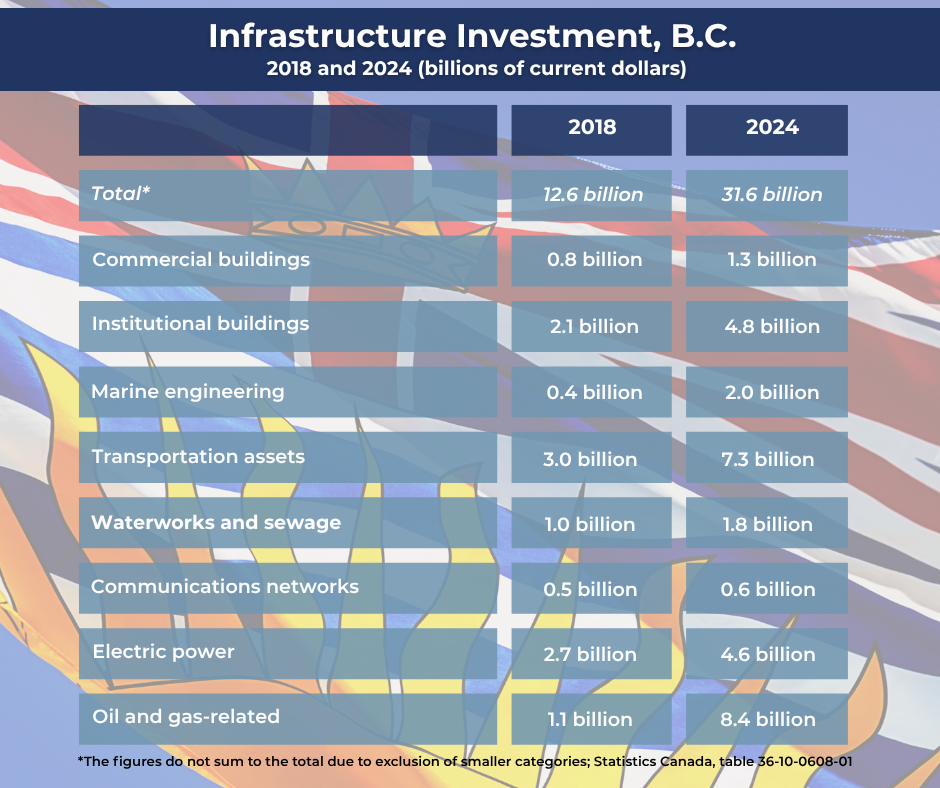 The value (in current dollars) of the stock of physical infrastructure assets in B.C. was $230 billion last year, almost double the figure ($121 billion) in 2018. Over the same period, the value of Alberta’s infrastructure stock rose from $154 billion to $214 billion, based on Statistics Canada’s latest estimates.