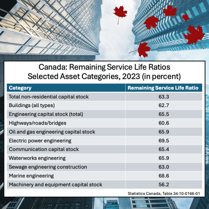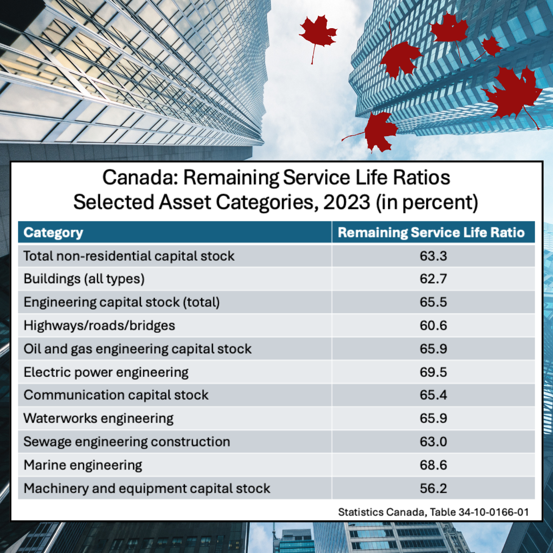 Each year, Statistics Canada publishes estimates of the “service life ratios” of the physical assets that – taken together -- make up the country’s non-residential capital stock. The service life ratio measures the percentage of an asset’s “useful” life that is left. To take an example: if an asset – say an industrial building – is deemed to have a 20-year service life and its remaining life is 15 years, then the service life ratio is 75%. A higher ratio means an asset has more time – relative to its estimated life, which varies greatly across asset categories -- before it needs to be replaced or rebuilt.