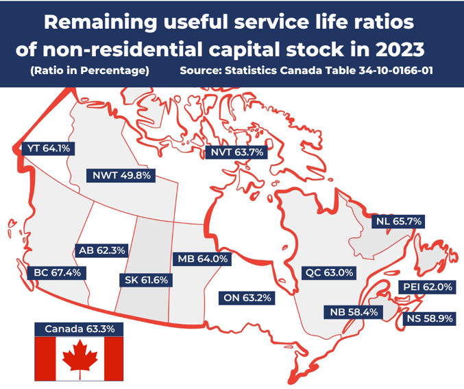 Overall, Statistics Canada estimates the remaining useful service life of the country’s non-residential capital stock at 63.3% (as of 2023). The ratio has fallen for eight consecutive years and is now lower than at any time since 2009. A declining service life ratio is a strong indication that capital investment in infrastructure, buildings, production facilities, and other tangible assets needs to increase to keep the economy productive and competitive.