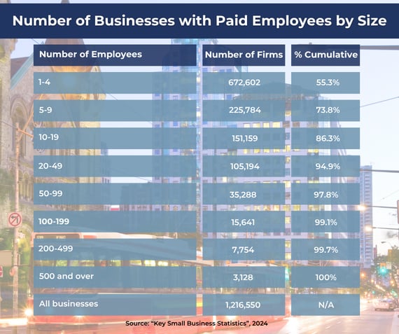 Canada is known as a jurisdiction where small and medium-sized enterprises (SMEs) are ubiquitous – found on every commercial street, every community, and every sector of the economy. By 2023, Canada was home to 1.22 million SMEs – defined as firms with between 1 and 499 paid employees. This definition excludes self-employed individuals who do not have other workers on the payroll.