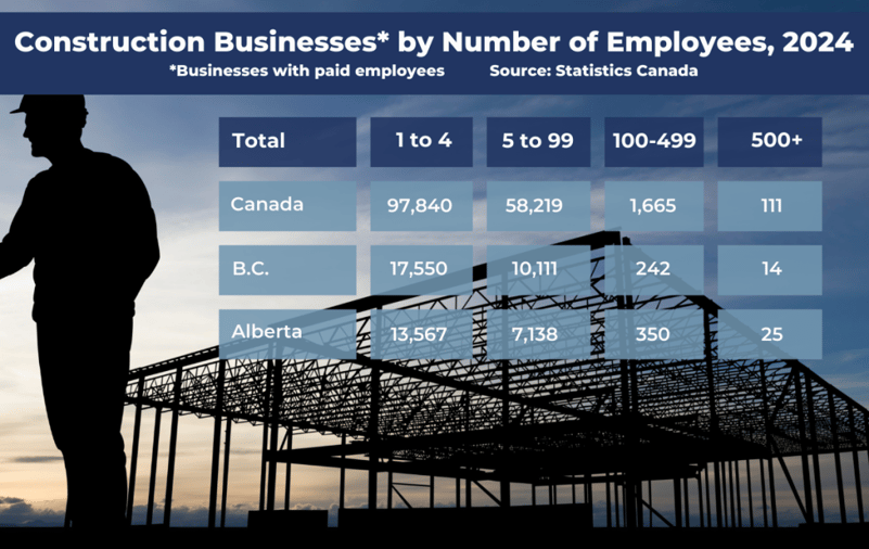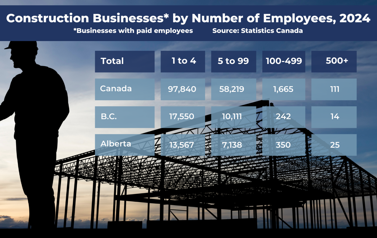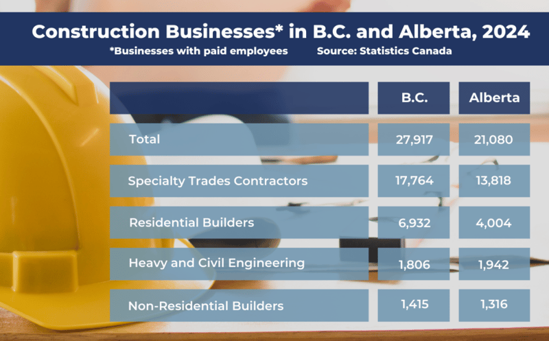 Figure 2 provides summary data on construction businesses in B.C. and Alberta as of 2024. B.C. is home to about 17.5% of Canada’s construction companies and Alberta to slightly more than 13% of the national total.