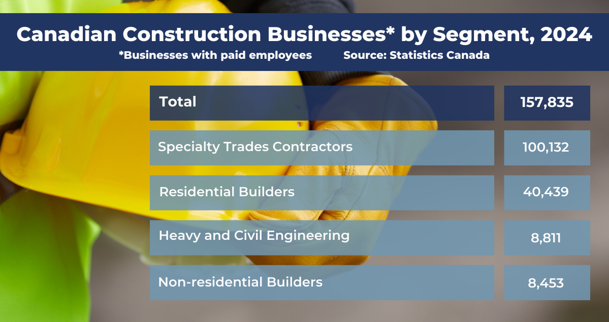 The four main sub-sectors that make up the broad construction industry are residential building construction, non-residential building construction, heavy and civil engineering construction, and specialty trades contractors. Figure 1 below shows the number of Canadian construction businesses (with paid employees) in each segment.