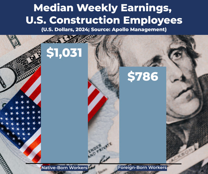 An important data point about the U.S. construction industry is that “foreign born” workers are paid less, on average, than the “native born” (Figure 2). This suggests the economic effects of reduced U.S. immigrant inflows – combined with more deportations of unauthorized workers – will be magnified in the case of construction. This is because many of both the departing and “never-arriving” foreign workers will end up being supplanted by higher-paid, native-born labourers and skilled trades workers.