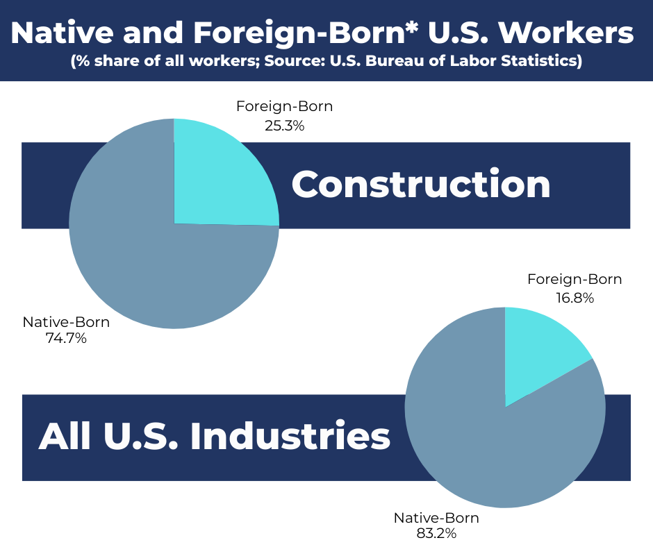 Figure 1 shows the distribution of foreign-born and native-born workers in the construction sector as well as the overall U.S. economy. Note that the estimates for the foreign-born include both legal first-generation immigrants and individuals working in the U.S. without authorization.