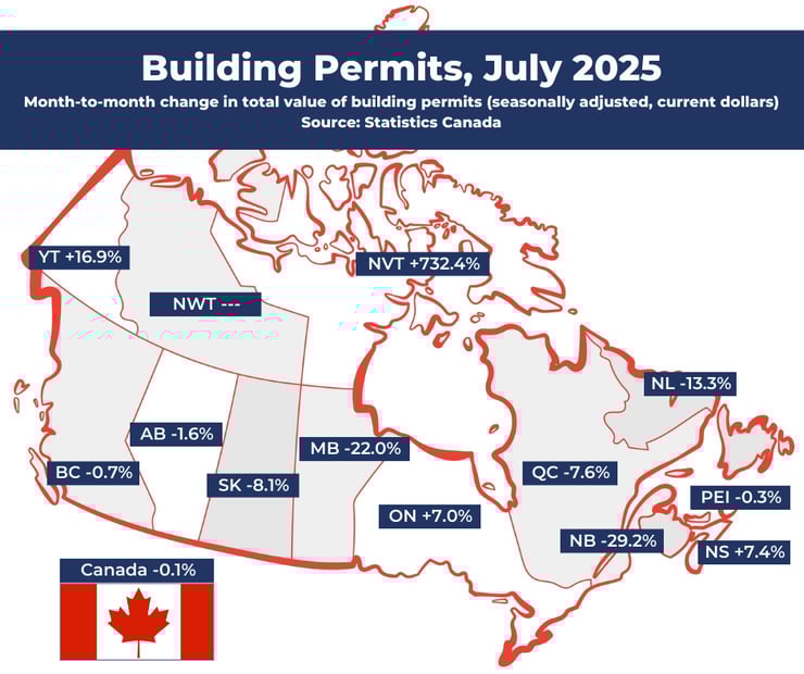 The current dollar value of building permits issued in July was basically unchanged from the month before, which itself saw a notable decrease from May. Total permits in July 2025 reached $11.9 billion on a seasonally adjusted basis. Gains in Ontario offset declines in Quebec and most of Western Canada.