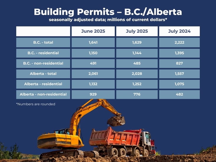 Total permit values in Alberta were essentially flat on a month-to-month basis. However, compared to July 2024, permits were up 30%, with both the residential and non-residential construction sectors showing strength year over year.