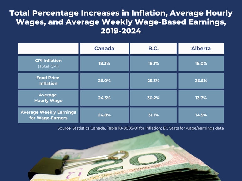 These wage data are not adjusted for inflation – which captures increases in the cost of living, as proxied by the all-items CPI. The table also reports Statistics Canada’s estimates for both total inflation and food price inflation for Canada, B.C. and Alberta, from 2019 to 2024. We include food price inflation because the rising cost of food arguably has been the most visible part of the inflation story over the last few years.