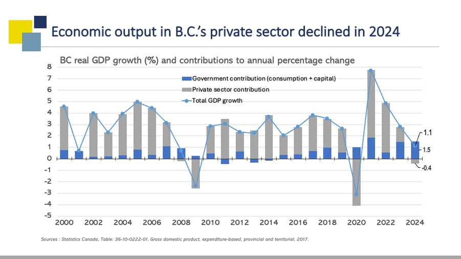 While the meagre 2024 expansion is disappointing and well below the province’s long-term average real GDP growth rate of 2.8 per cent, the composition of that feeble growth is even more troubling. The only reason B.C.’s economy grew at all in 2024 was another surge in government activity. Excluding government spending and public sector capital investment, the rest of the economy contracted by 0.4 per cent last year. The much larger and more important private sector—which accounts for three-quarters of all economic output— was actually in recession in 2024. When the numbers for 2025 are available, we are almost certain that they will show this “private sector” recession persisted.