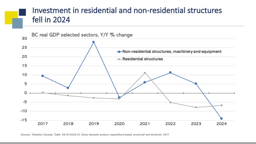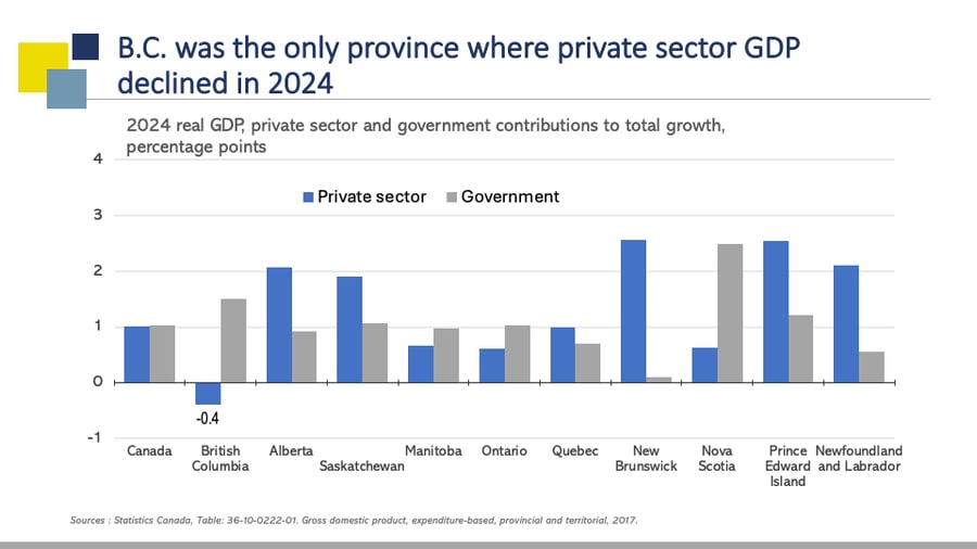 The province’s high cost of living and weak private sector job growth also weighed on household spending in 2024. Real household consumption rose just 1.1 per cent, about one-third the typical pace. With the province’s population growing by nearly 3 per cent last year, per capita consumption declined — an indication that many households are feeling squeezed and cutting back on discretionary outlays.